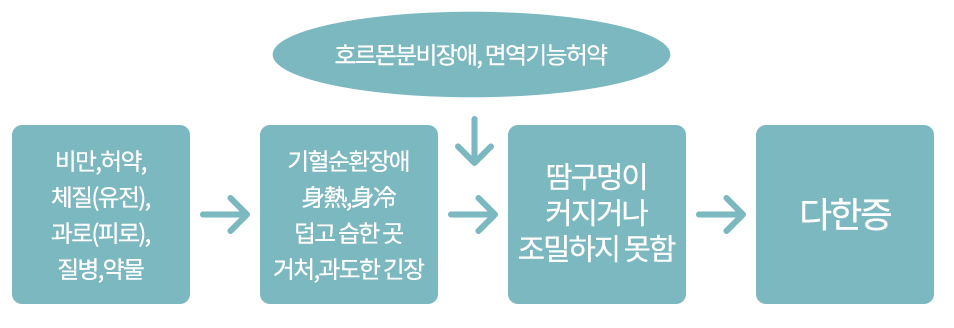 체질, 과로(피로), 호르몬분비이상(갱년기), 허약, 질병, 약물, 기혈순환장애, 비만 등