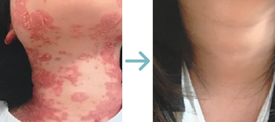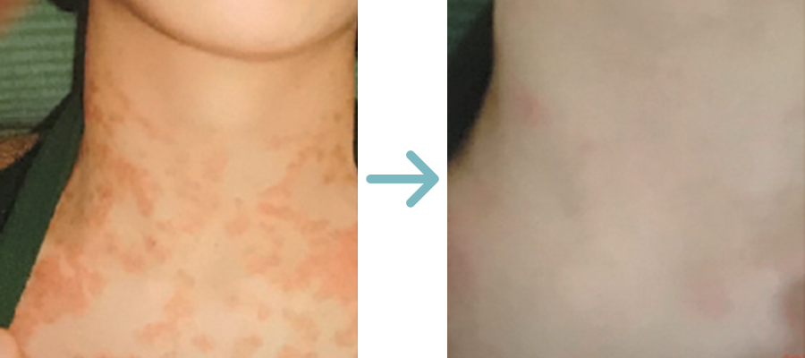 월경 전, 중에 넓게 구진, 홍반, 두드러기, 가려움이 있다. 월경 주기가 불규칙하고 양이 많고 유방이 단단하고 통증이 있다. 가슴이 답답, 성격이 급하며, 옆구리 통증, 입이 쓰고 마르며 소변이 누렇다. 청소년이 많으며 평소 과민, 예민한 성격이다.