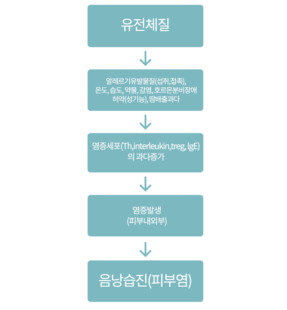 식품,화학물질,중금속, 딱딱하고 두꺼운 옷의 압박,인공섬유접촉,자극으로 발생,악화됨. 알레르기체질